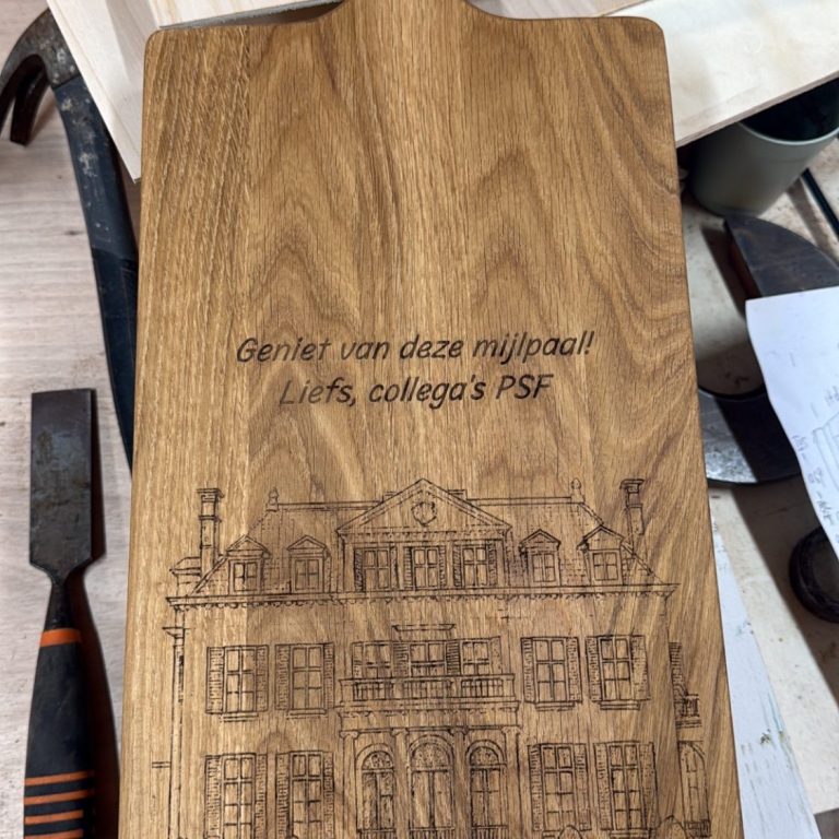 Wij werken met verschillende houtsoorten, formaten en nemen de tijd om elk product zorgvuldig af te werken. Zo ontstaat een uniek houten item dat past bij jou en het moment waarvoor het bedoeld is.